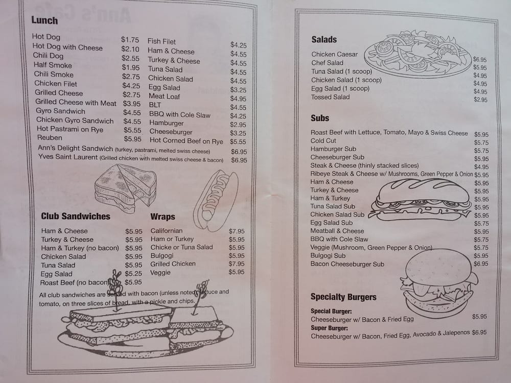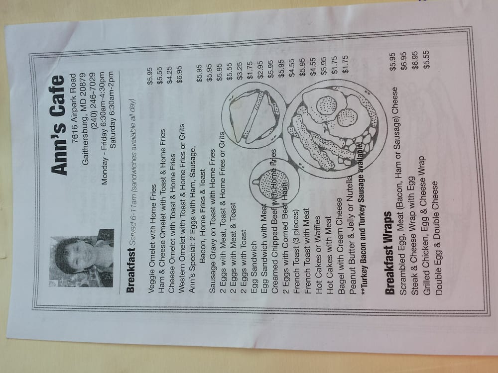 Ann's Cafe, located in Gaithersburg, MD, offers a diverse menu perfect for breakfast, brunch, and lunch. The cafe provides a range of omelette platters, including the indulgent Meat Lovers Omelette and the flavorful Veggie Omelette. Additionally, their breakfast platters, such as Ann's Special Platter and Salmon Cake Breakfast Platter, offer a satisfying meal to start the day. For those looking for a quick bite, the cafe also serves delicious breakfast sandwiches like the Egg Cheese Sandwich and Meat Egg Cheese Sandwich. With amenities like outdoor seating, free Wi-Fi, and TV, Ann's Cafe provides a comfortable and enjoyable dining experience. Guests can expect prompt service and a welcoming atmosphere at this charming cafe.